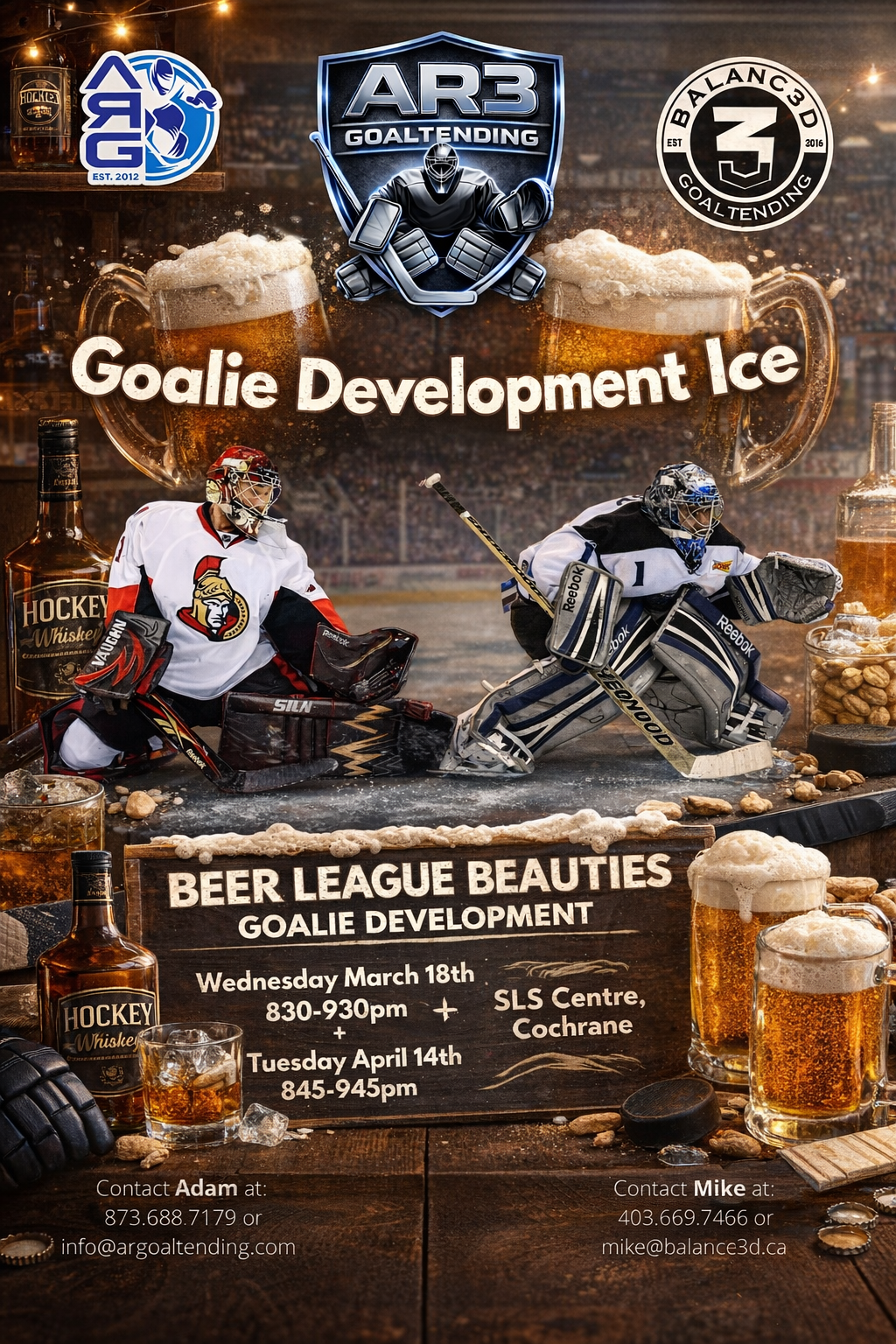 ARG and Balanc3d want to add this special program so that all the men’s league goaltenders (female and male) have an ice time that they can just enjoy the company of other like minded goalies, get some tips and tricks, and maybe enjoy a few cold ones/sips of whiskey after the practice! No pressure, just fun and educational. You get out what you put in!