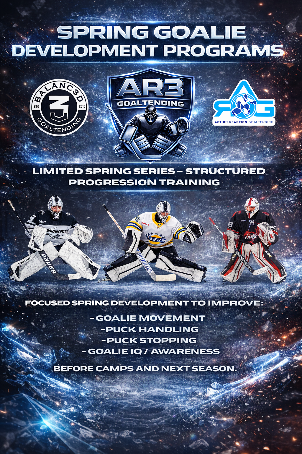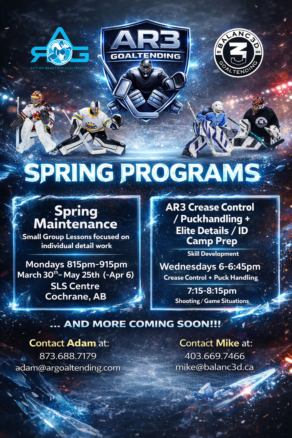 Back again! Here is our UPDATED 2026 Cochrane Spring ice times. We have our Spring Maintenance Program set up for Mondays and our NEW* TOTAL GOALIE Sessions on Wednesdays, so spots go fast. These sessions are for maintenance and preparation for your spring tryouts and ID Skates, spring hockey programs and just to stay sharp in the spring months. Both female and male goaltenders are welcome in all sessions.