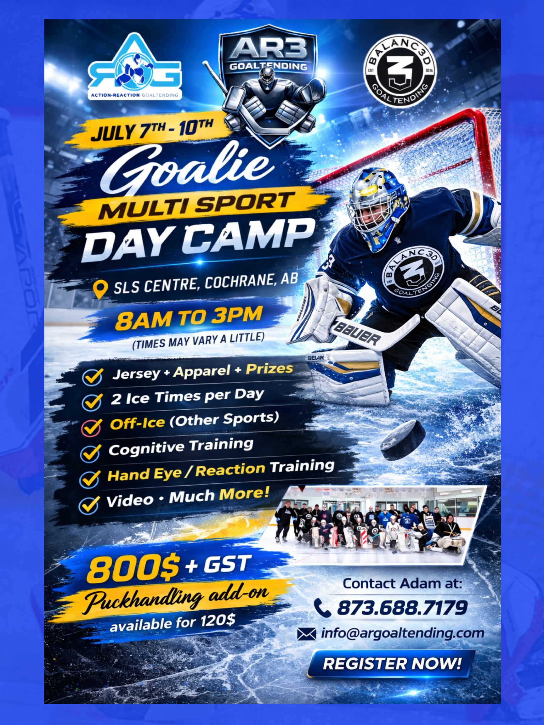 To register, please fill out the form below or email us at adam@argoaltending.com to reserve your spot. The cost is $800+GST for goalies. (Additional $120 puckhandling package option, session every morning 30 minutes prior to mobility ice)
